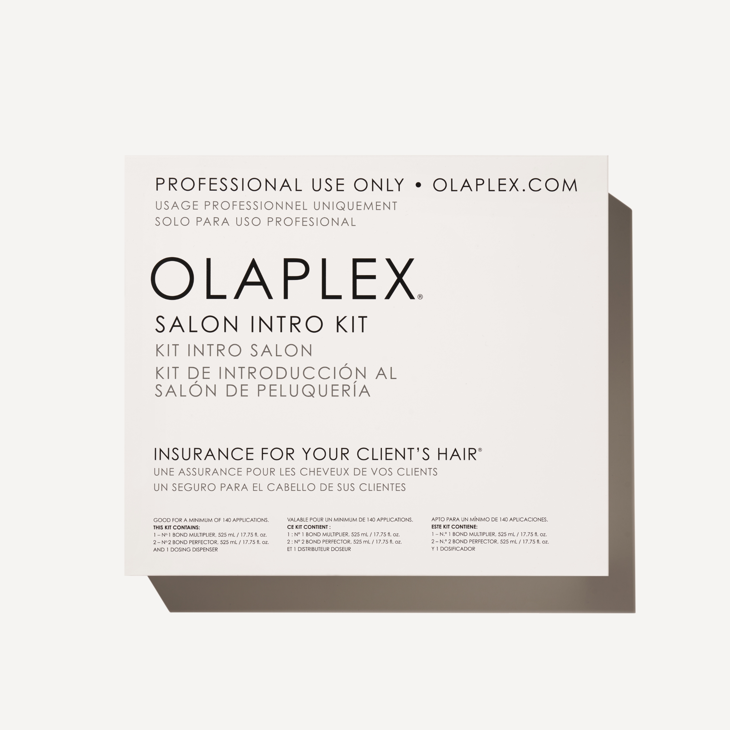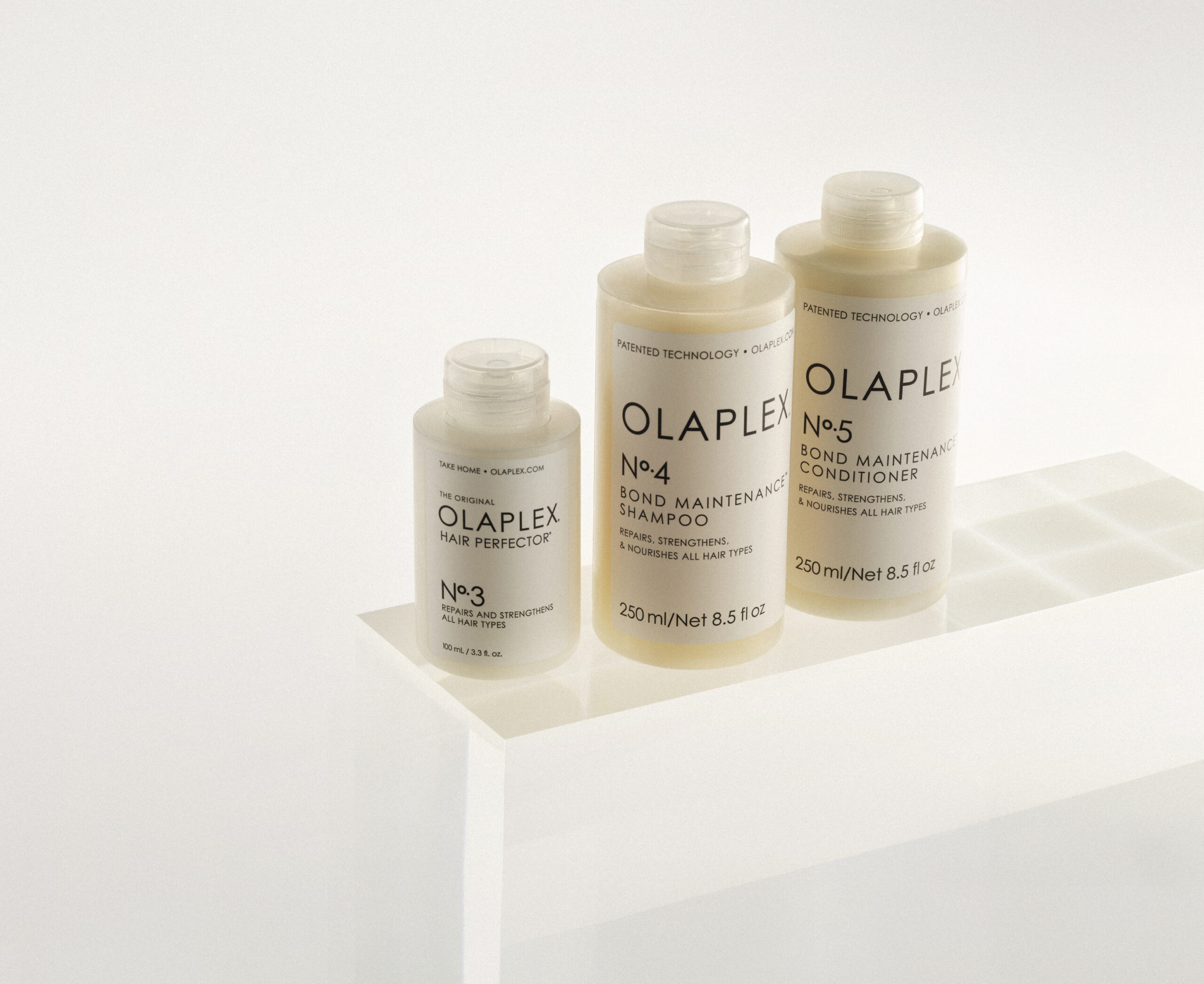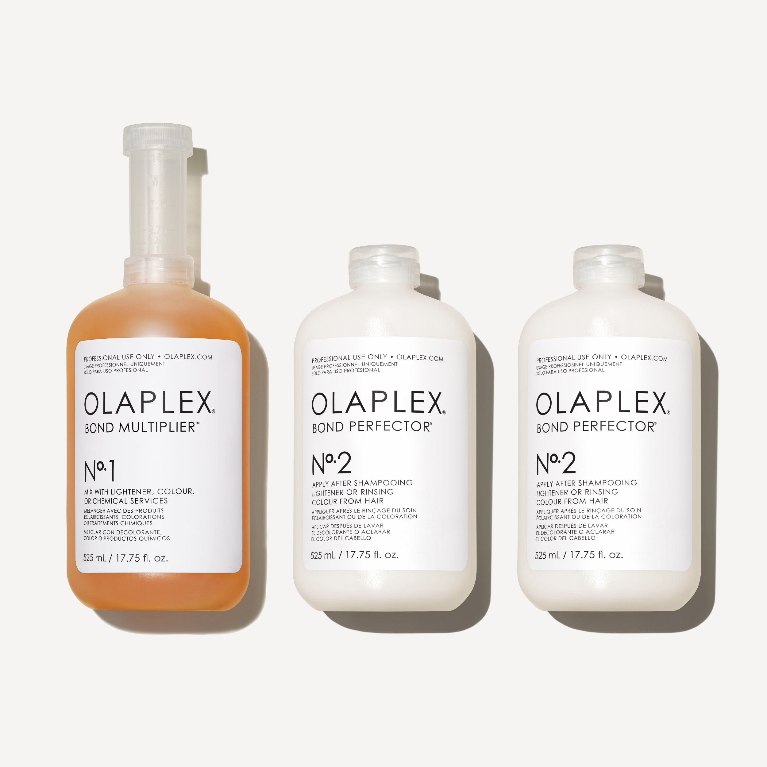 Përmasa të vogla të Nº.1 Bond Multiplier™ dhe Nº.2 Bond Perfector® – trajtimi profesional me dy hapa, i pari në llojin e vet, që bëri të mundur riparimin dhe parandalimin e dëmtimeve gjatë çdo shërbimi në sallon. Përqendrimi më i lartë i teknologjisë së patentuar OLAPLEX Bond Technology™ vepron në nivel molekular për të zvogëluar dëmtimet e flokëve duke riparuar të tre lidhjet e flokëve – përfshirë lidhjet disulfide të shkaktuara nga dëmtimet kimike, termike dhe mekanike. Mund të shtohet në çdo trajtim kimik ose të përdoret më vete.